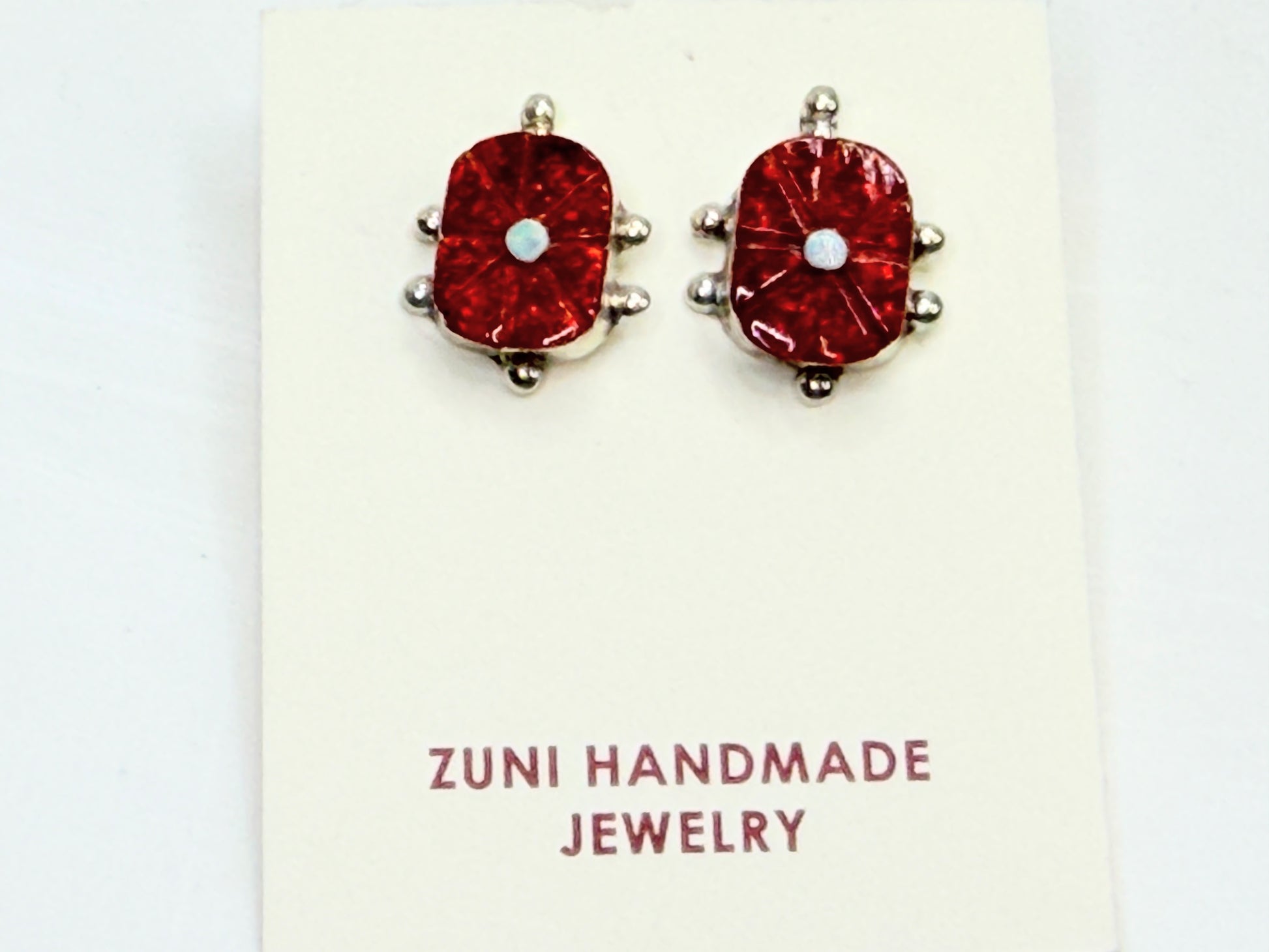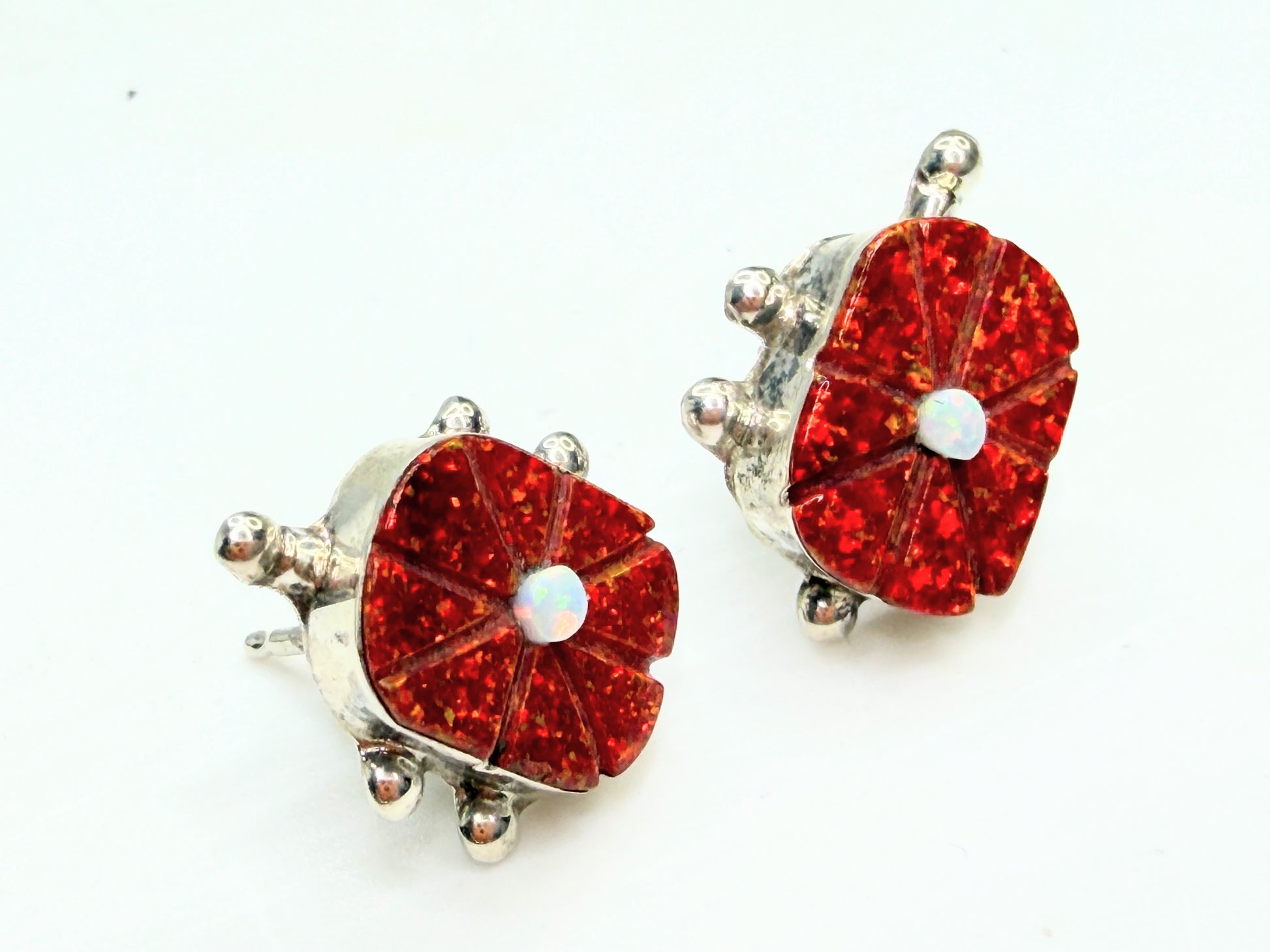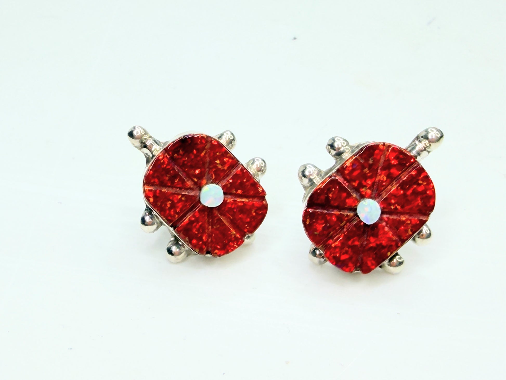 A finely executed pair of vintage Zuni handmade sterling silver earrings by Sarah Bowannie, featuring vibrant red opal inlay carved in a radiating floral motif with a contrasting white opal center. The domed surface displays strong fire and depth, framed by smooth sterling bead accents in traditional Zuni styling. Compact yet visually striking, these earrings carry both sculptural presence and refined craftsmanship. Hallmark verified.